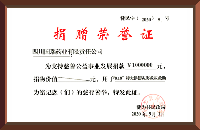 2020年8月18日,四川省犍为县遭遇百年未遇特大洪涝灾害,开云网页版·网站在线登入-开云(中国)集团国瑞药业向犍为县灾区捐赠现金100万元。